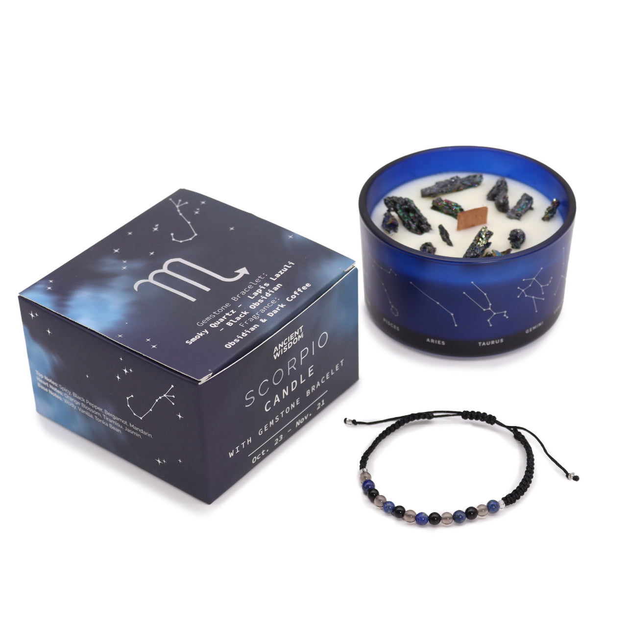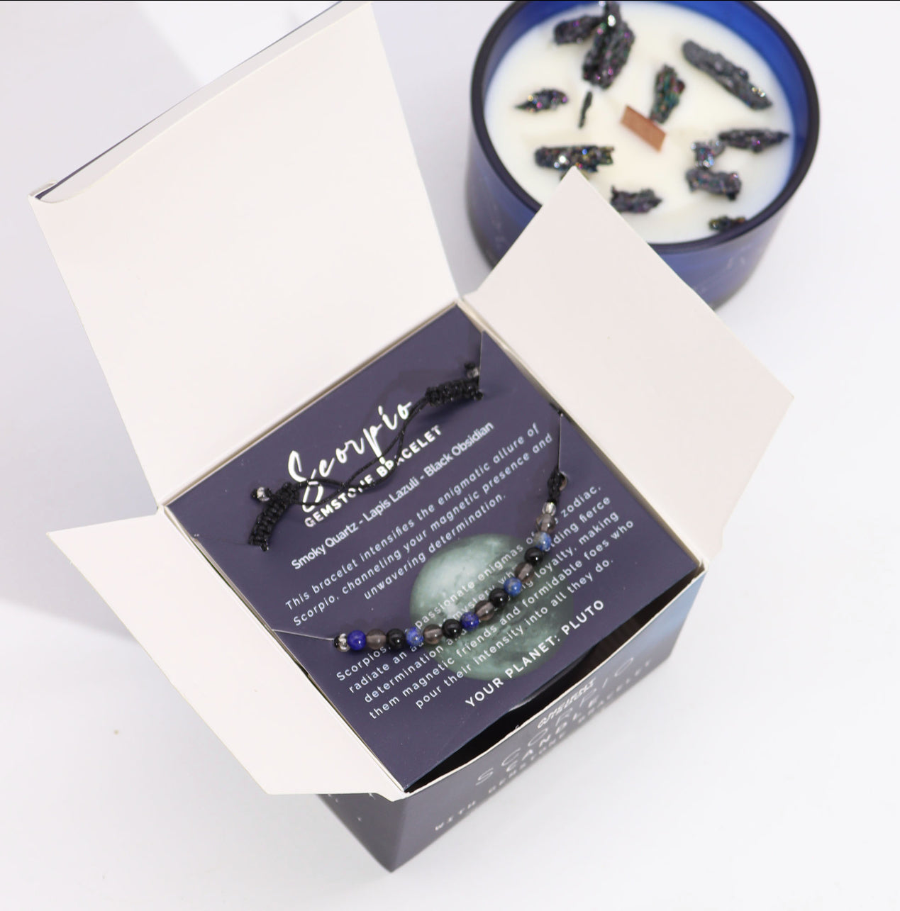 Su pulsera combina cristales que armonizan la profundidad y determinación de Escorpio.