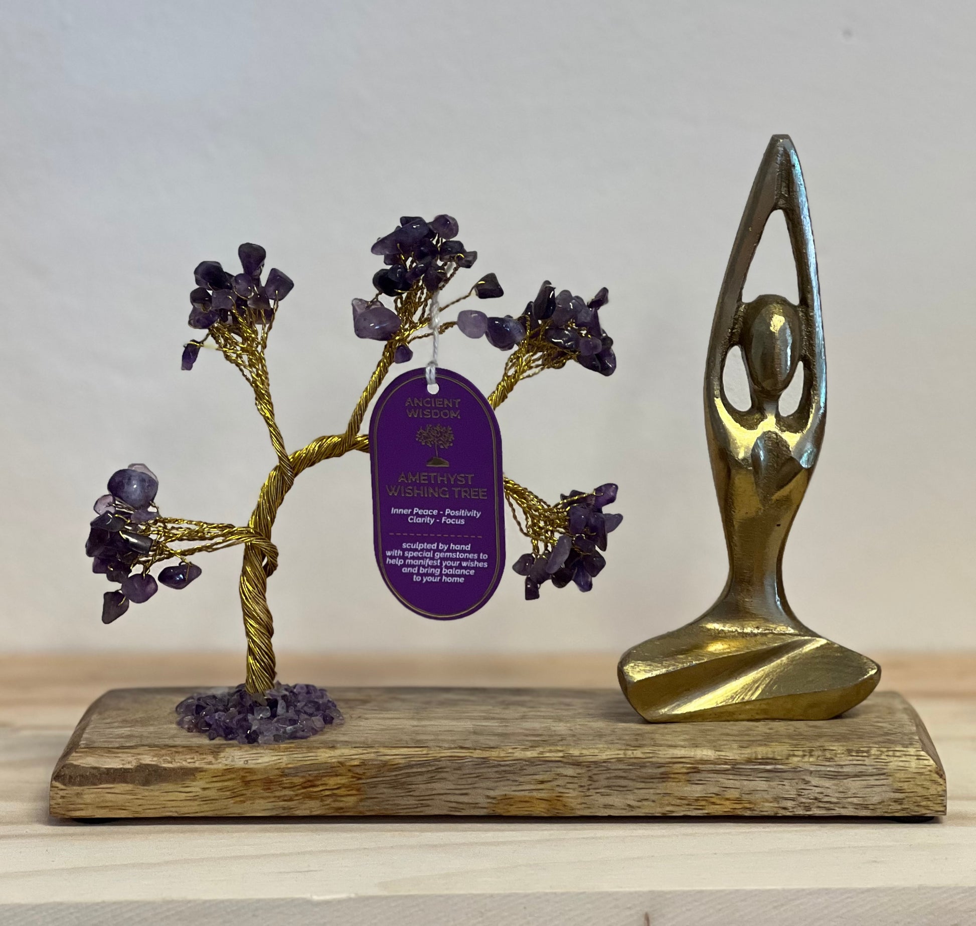 Este elegante Jardín de Yoga está completamente elaborado con piedras naturales de amatista, símbolo de calma, claridad y equilibrio interior. Cada una de sus 100 gemas violetas ha sido cuidadosamente ensamblada a mano sobre ramas de alambre dorado, formando un árbol que irradia serenidad y belleza espiritual.