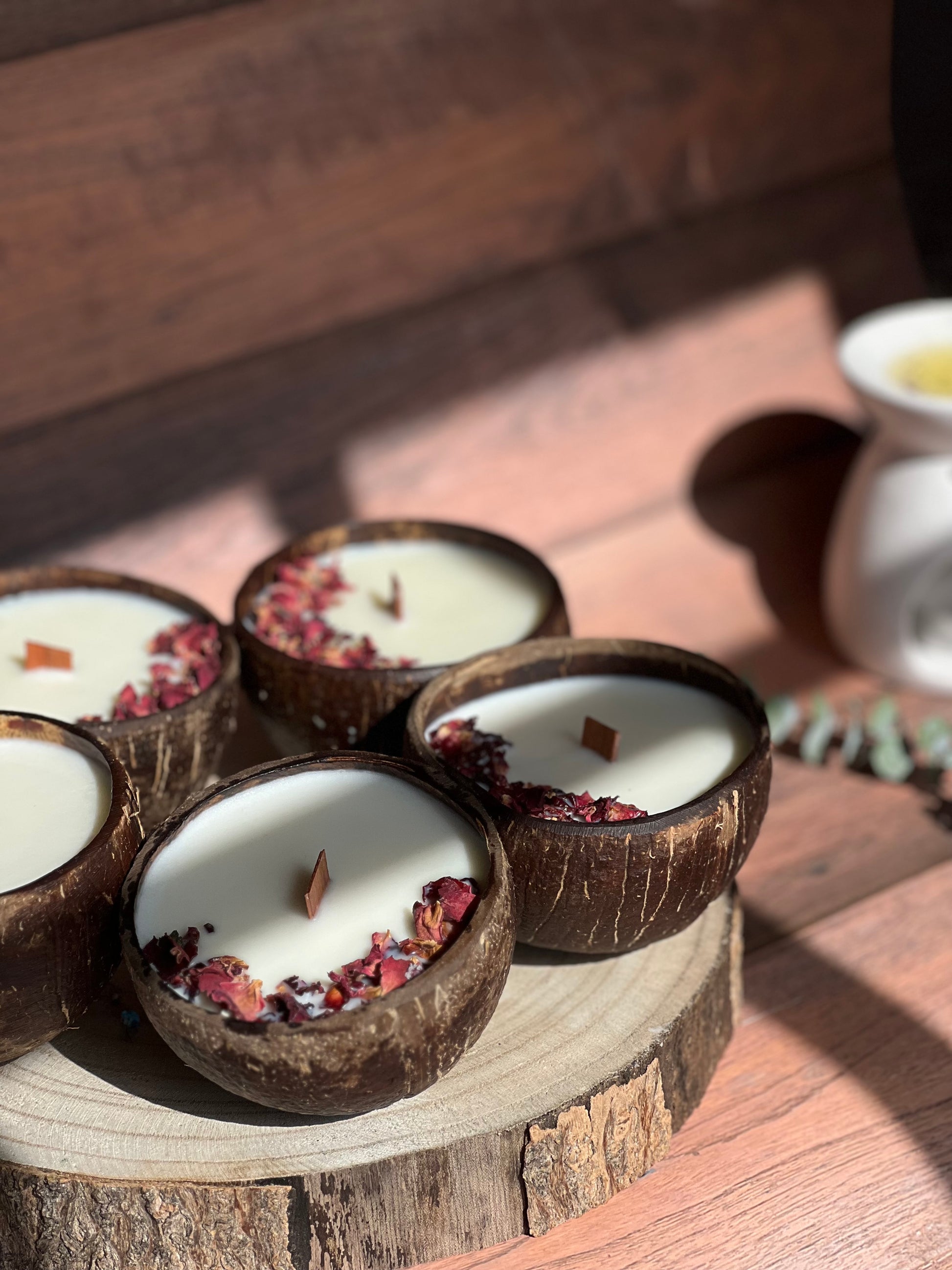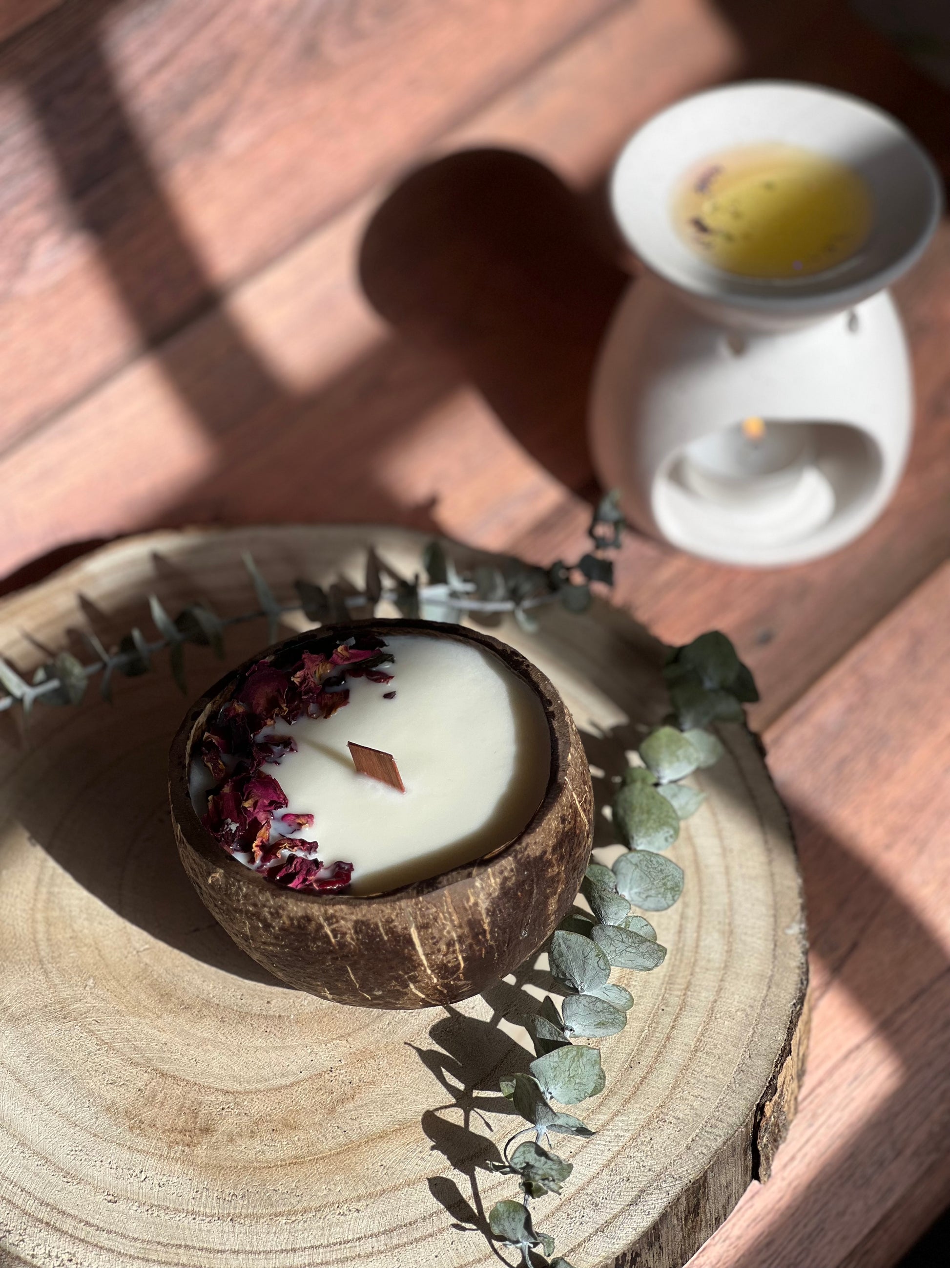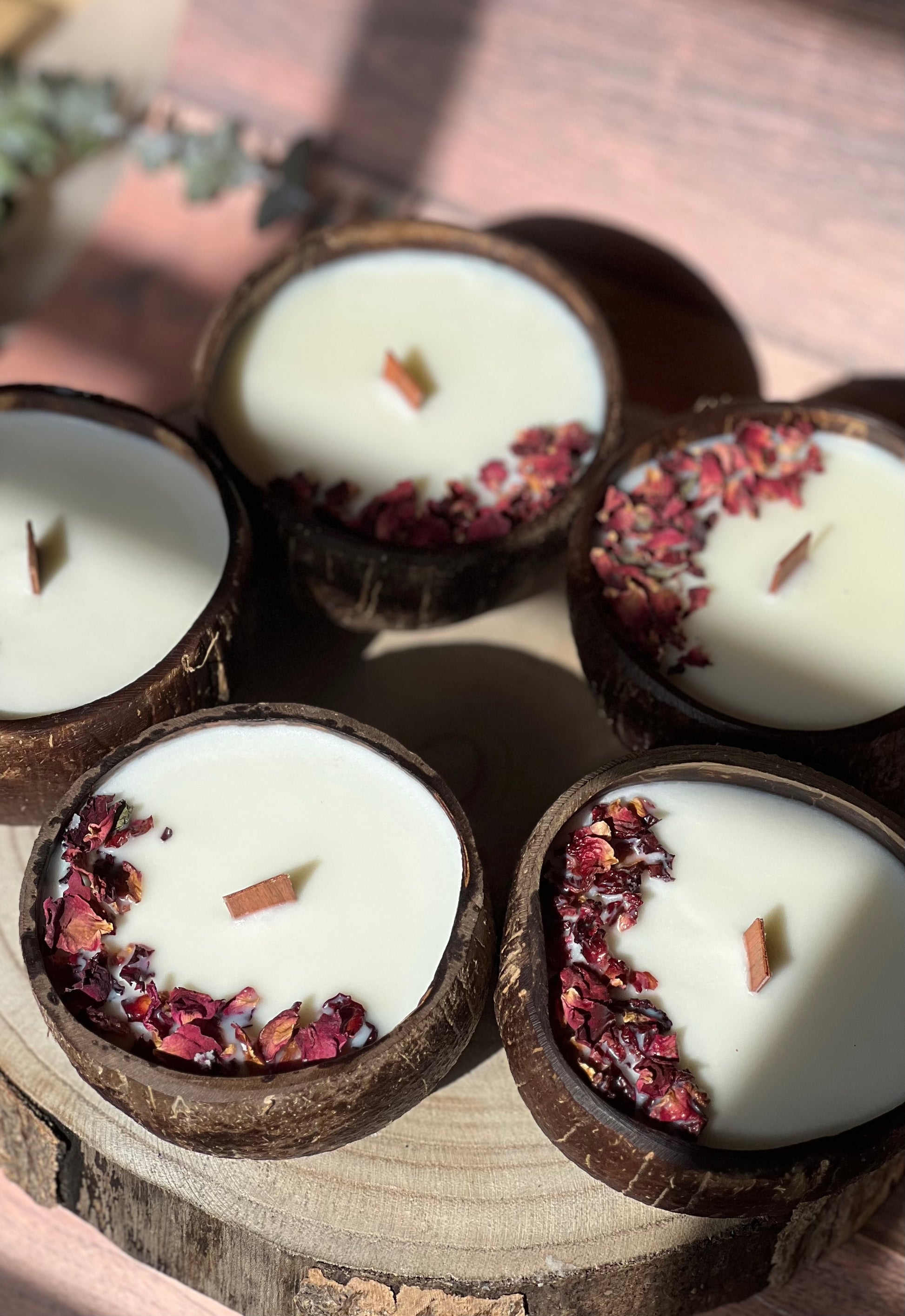 You will love this beautiful candle made in a natural coconut container, with a wooden wick, rose petals and a jasmine and bamboo scent! 💕