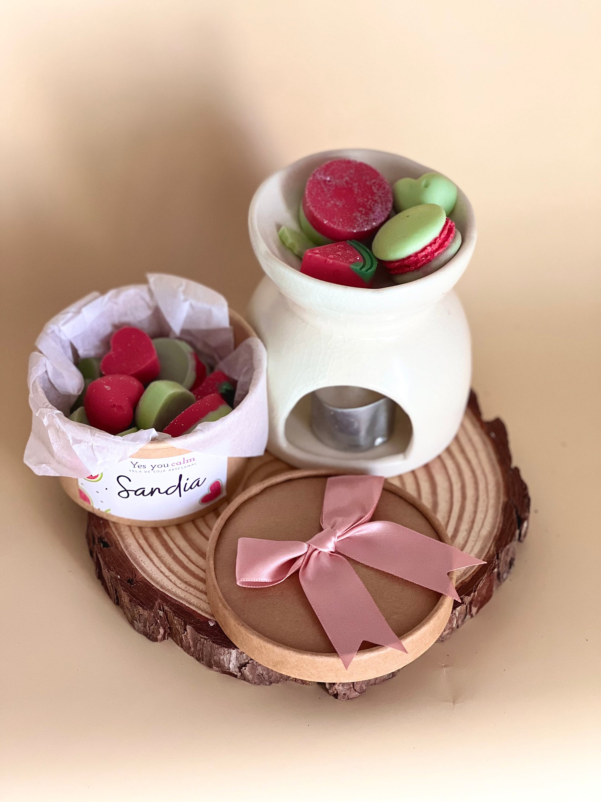 Macaroon, purple circle, green and hot pink hearts and leaves, these are the figures that make up the wax melts from the limited collection of Watermelon. Fruity and sweet aroma that simulates Watermelon candies! ✨